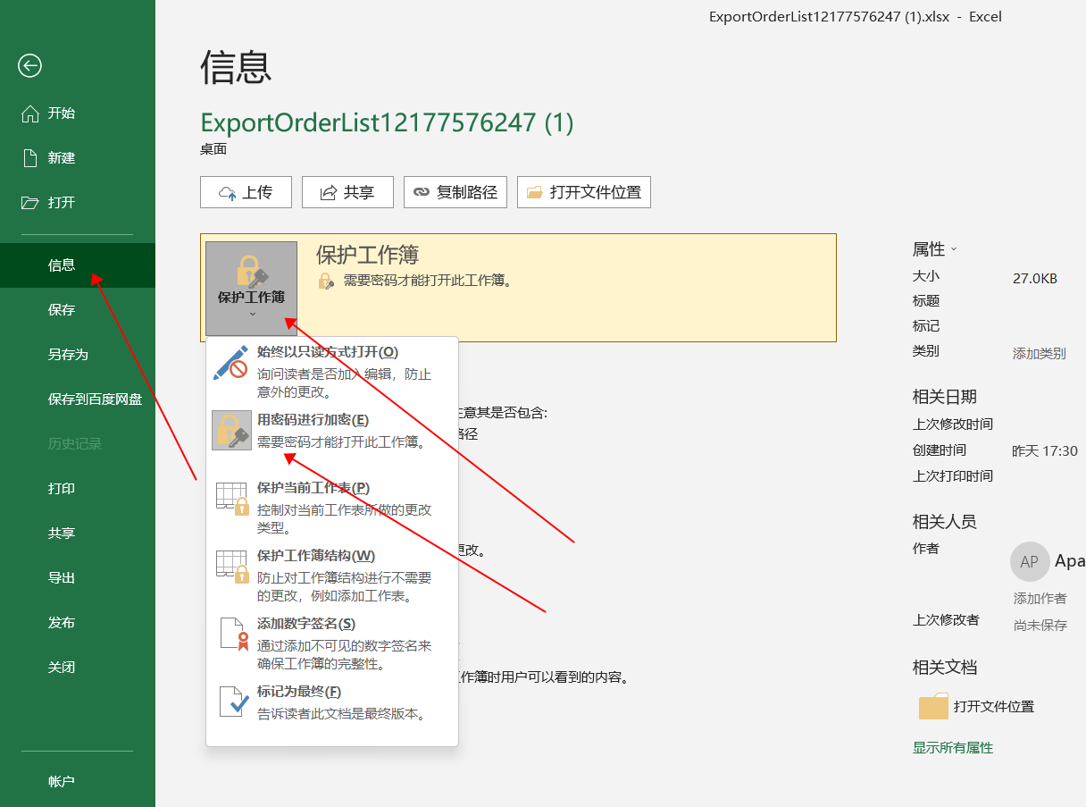 第三步:以此点击“信息”→“保护工作簿”→“用密码进行加密”